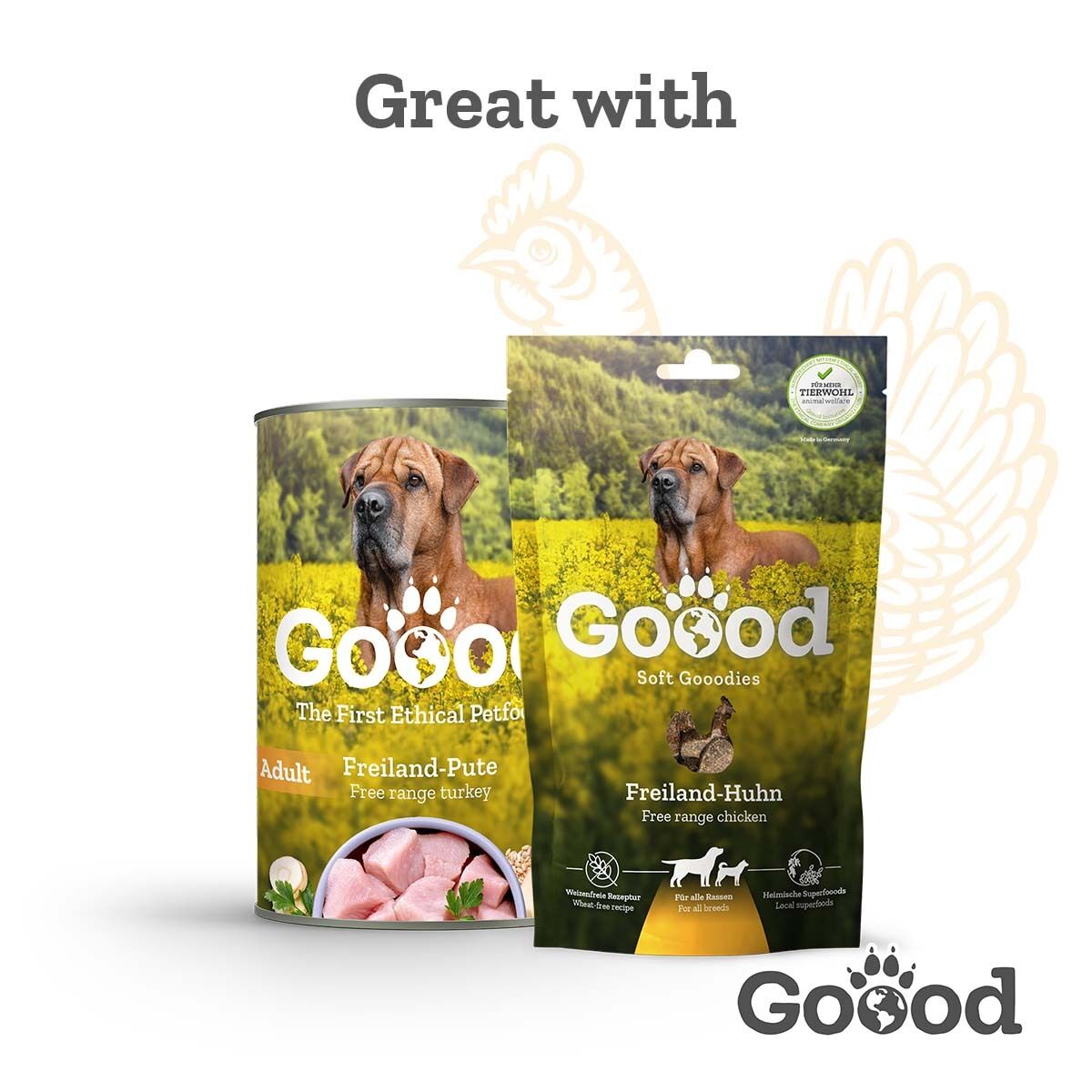 Our free range chickens have space to run about happily and scratch the ground. All the food they eat is totally natural. The tender chicken is naturally full of protein, iron and zinc. It is combined with barley and parsnips from our region. The high-quality ingredients are gently prepared and supply your four-legged friend with all the important nutrients he or she needs for an appropriate diet. Our recipe with valuable wholegrains is easy to digest. It needs no added sugar or artificial colours, flavours or preservatives. Chicken and parsnips are good for the digestion and metabolism.