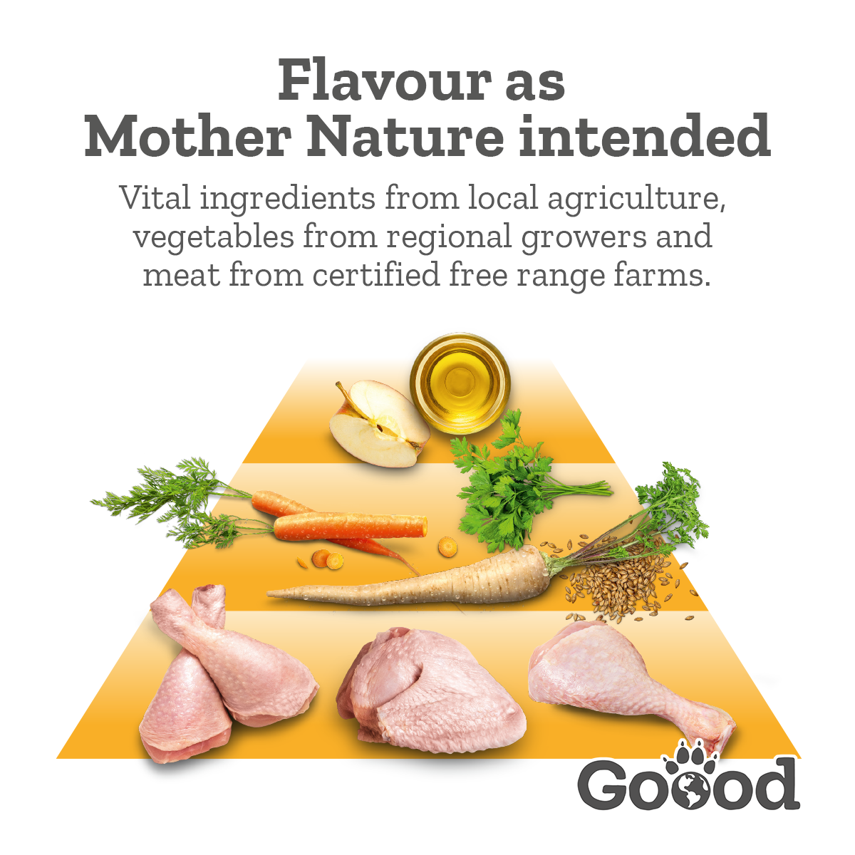 poultry protein* (25 %, of which 80 % chicken) from strictly controlled rearing, wholegrain maize, maize flour, wholegrain barley (11.5 %), oils and fats (4.5 %), dried beet pulp, linseed (2.3 %), hydrolysed protein, apple pomace* (1.25 %), lignocellulose, potassium chloride, sodium chloride (from sea salt), carrots* (0.2 %), parsnip* (0.2 %), parsley root*, yeasts* (extract, 0.2 % = 0.04% mannan oligosaccharides), chicory powder (0.15 % = 0.01 % inulin), parsley leaves* (0.07 %), (total regional vegetable mix 0.7 %)