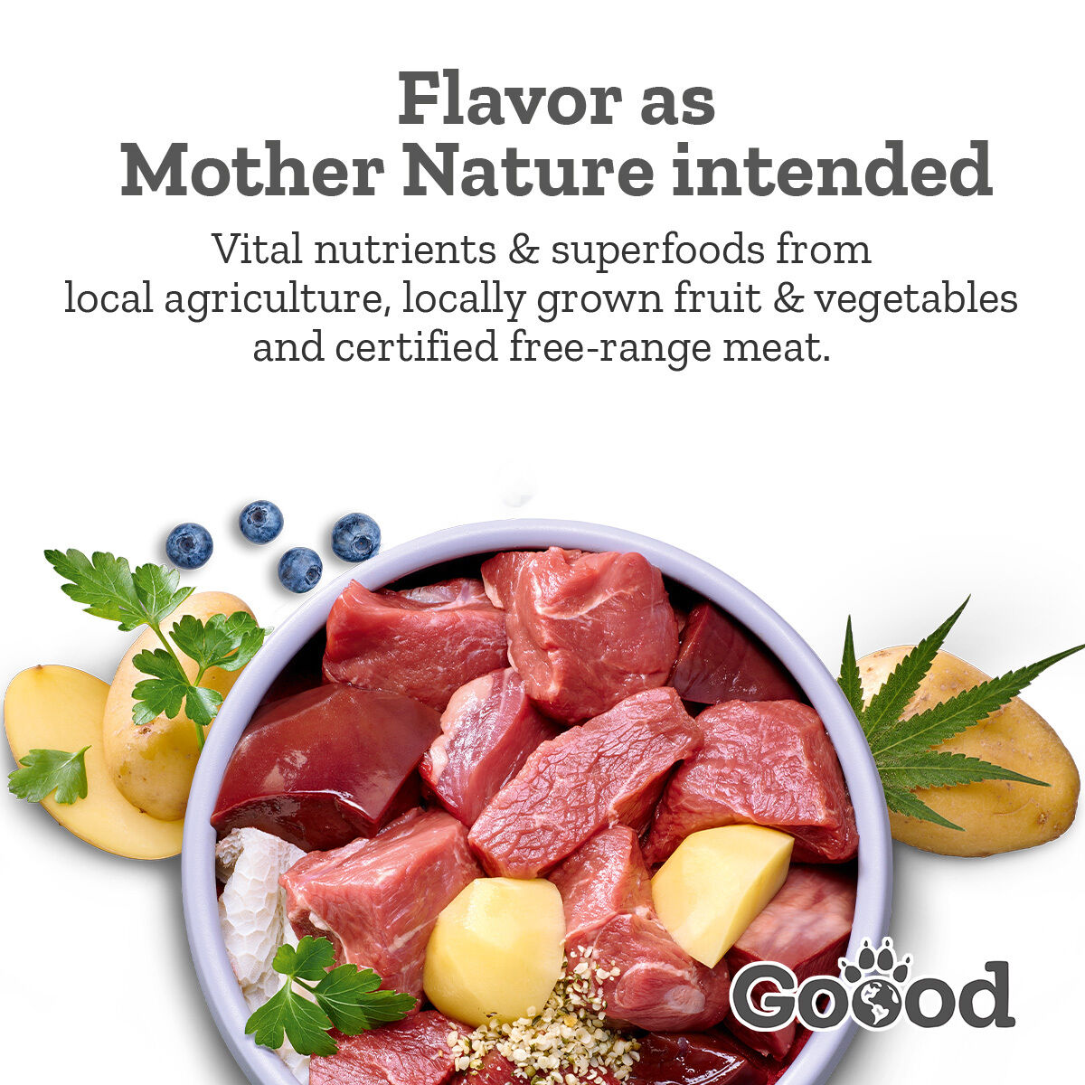 lamb (total 65 %, consisting of lamb meat, lamb heart, lamb stomach, lamb liver), potatoes (4 %), parsley (0.5 %), blueberries (0.5 %), hemp seeds (0.4 %), glucosamine (0.4 %), chondroitin (0.4 %)